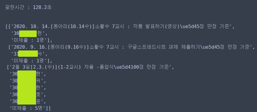 실시간으로 변동이 되는 현황판을 만드는 것은 못하고, 결국 연락을 취해야 하는 과제 미제출자의 명단을 출력하는 코드를 만들었다.