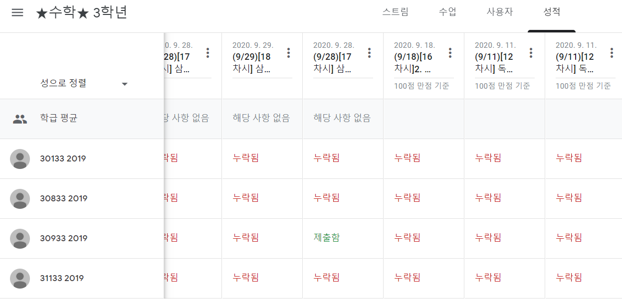 - 구글 클래스룸 해당 수업에 들어가서 '성적' 탭을 들어가기