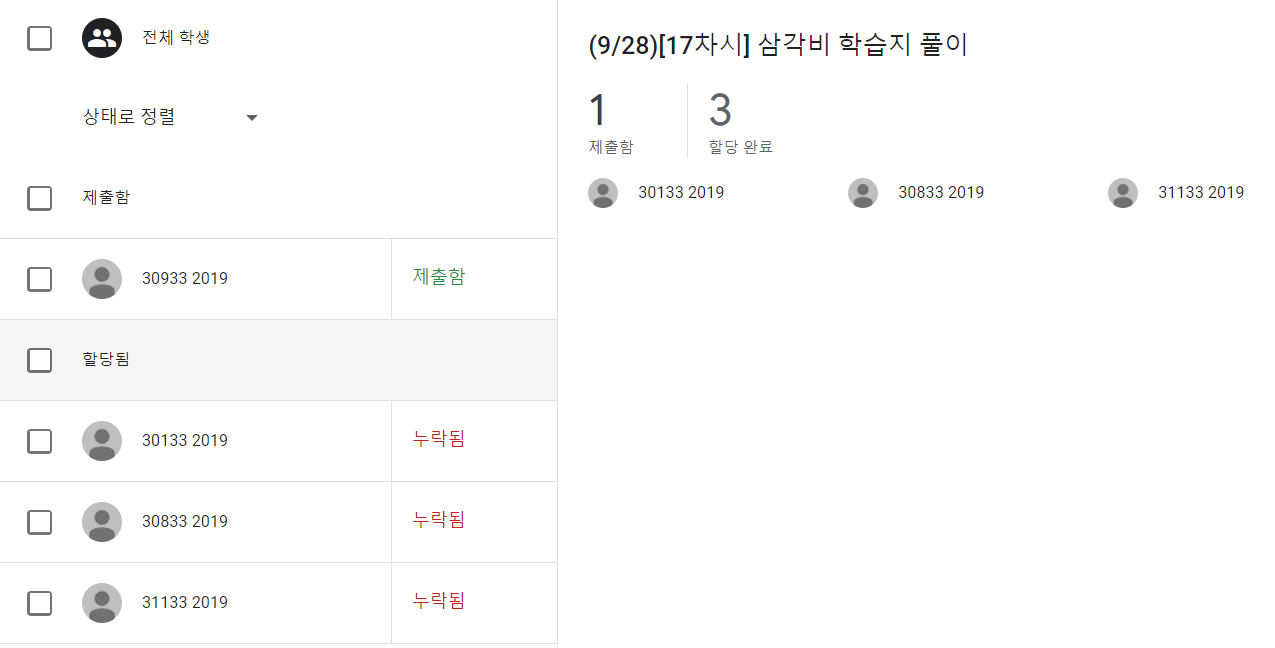 - 각 수업을 눌러서 할당 완료(과제 제출 전)인 학생 찾기
